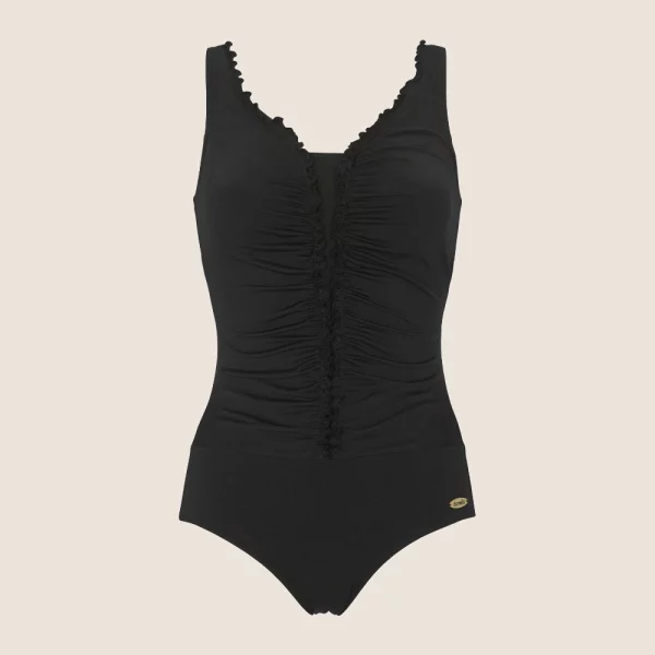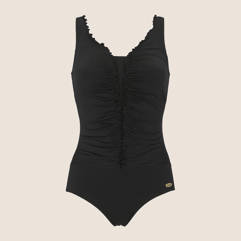 Damella baddräkt Jennifer i klorresistent material. Med powernet-foder, vadderad bh och drapering framtill. Bekväm passform med reglerbara axelband.