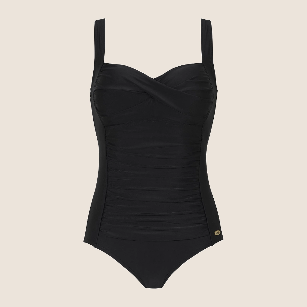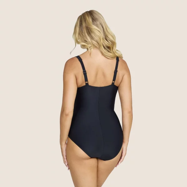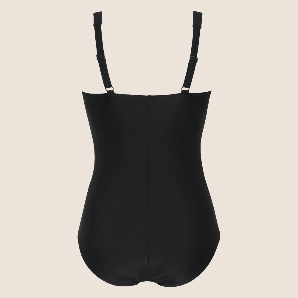 Baddräkten har protesfickor för extra trygghet och en shapingeffekt framtill som formar en slankare silhuett. De justerbara axelbanden gör det enkelt att anpassa passformen efter dina behov, vilket ger både komfort och självförtroende vid strand och pool.