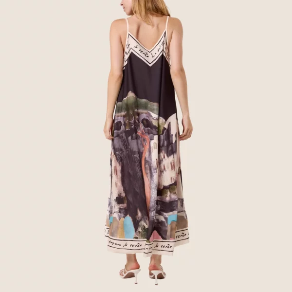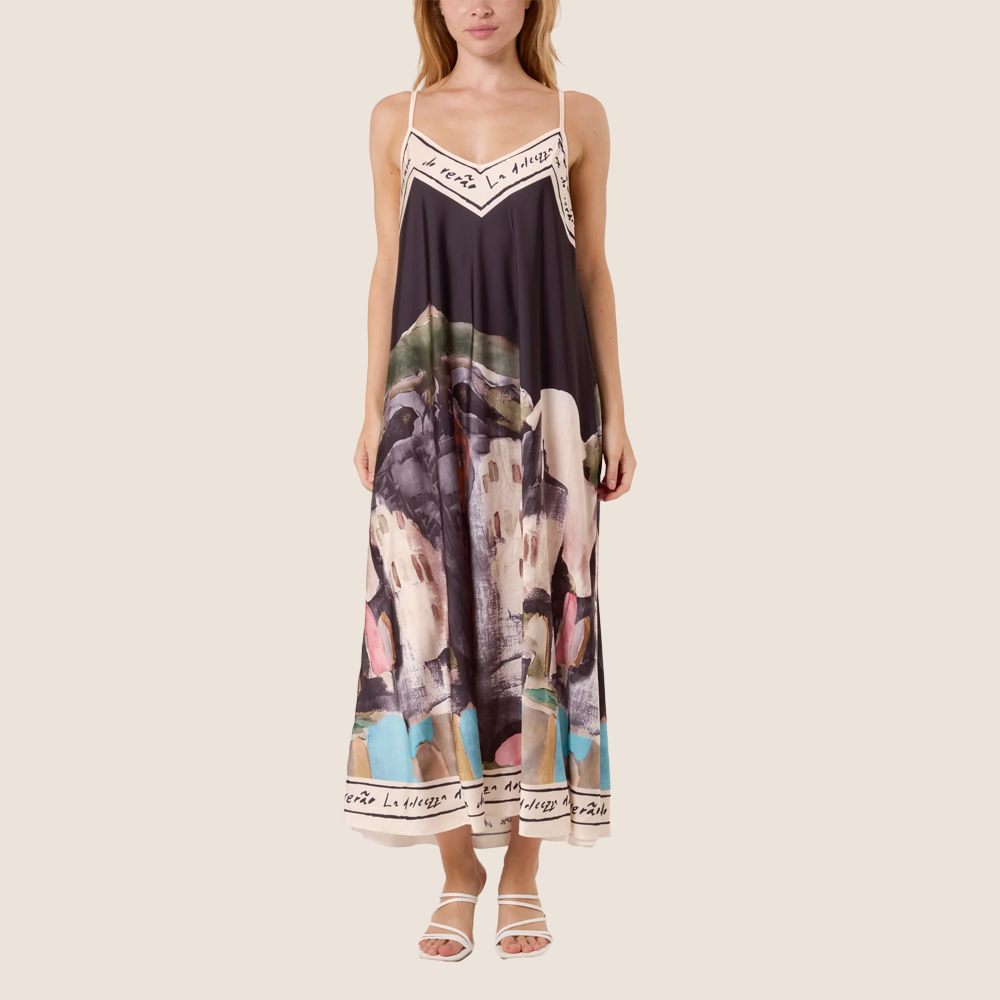 Cami Border Print Swing Dress är en feminin och avslappnad klänning med ett mjukt fall och en luftig silhuett. De smala axelbanden och den lediga passformen ger en elegant och somrig känsla, samtidigt som det dekorativa bårdmönstret tillför en exklusiv detalj.