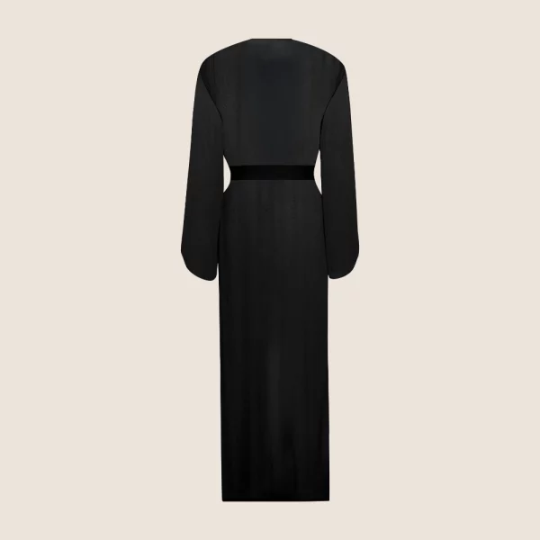 Modellen har en lös och rak passform som ger ett svepande fall runt kroppen. De vida ärmarna skapar en vacker siluett med mycket rörelse och gör plagget extra bekvämt i varmt klimat. Den avtagbara skärpet ger dig möjlighet att forma midjan och skapa mer definition när du önskar.