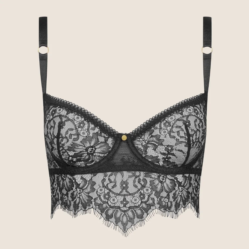 Elegant bralette i balconette modell med bygel i exklusiv barockspets och swiss dot-mesh från Maison Close. Ger vackert lyft, stabilitet och sensuell passform.