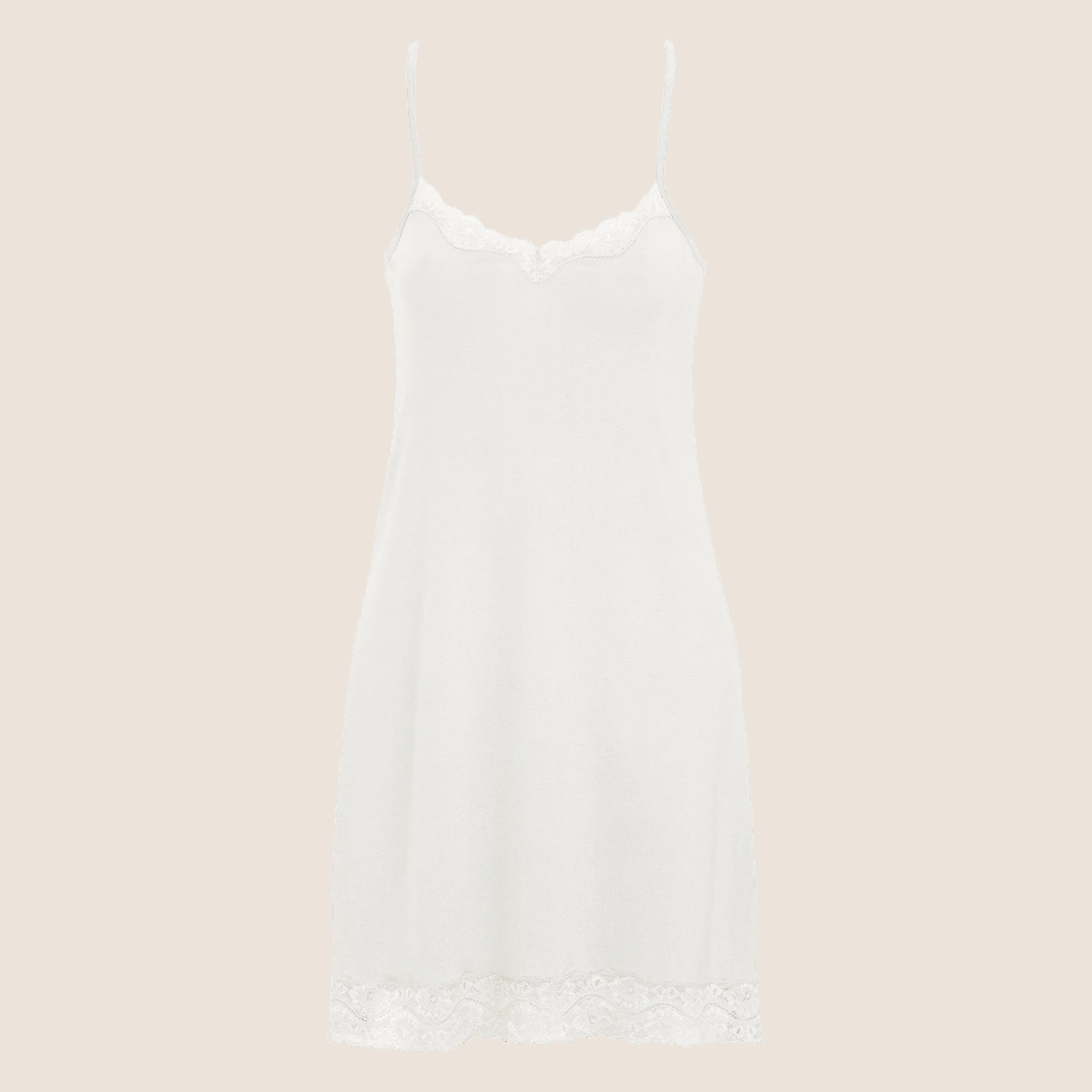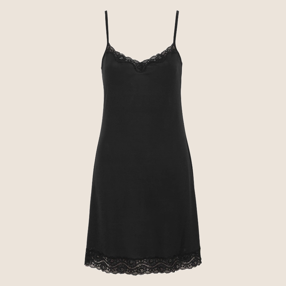 Ärmlöst nattlinne i stickat siden från Damella med justerbara axelband, V-ringning och spetsdetaljer. Svalt, mjukt och elegant – perfekt för natten.