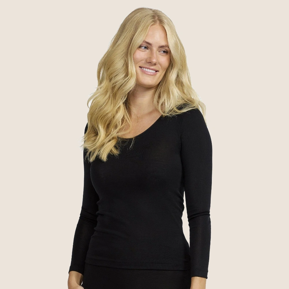 Mjuk och varm långärmad tröja i merinoull och silke från Damella. Perfekt som basplagg året runt och älskad för sin naturliga komfort och elegans.