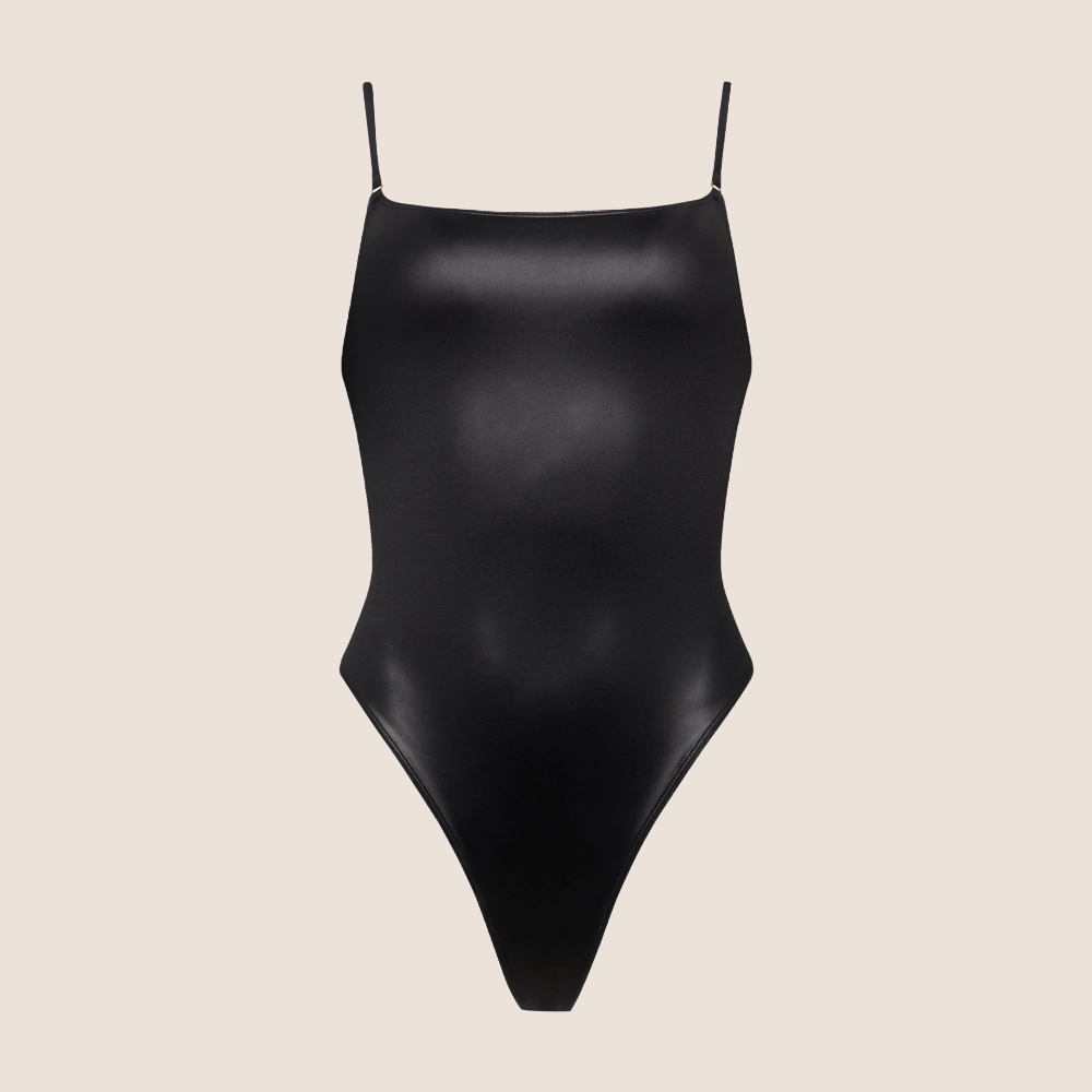 Denna svarta baddräkt kombinerar minimalistisk fransk estetik med modern attityd. Den höga skärningen framhäver benen, medan stringskärningen baktill ger ett smickrande och självsäkert uttryck. De tunna justerbara axelbanden skapar en feminin linje och gör passformen personlig. Maison Close beskriver modellen som en one-piece med justerbara straps och thong style.