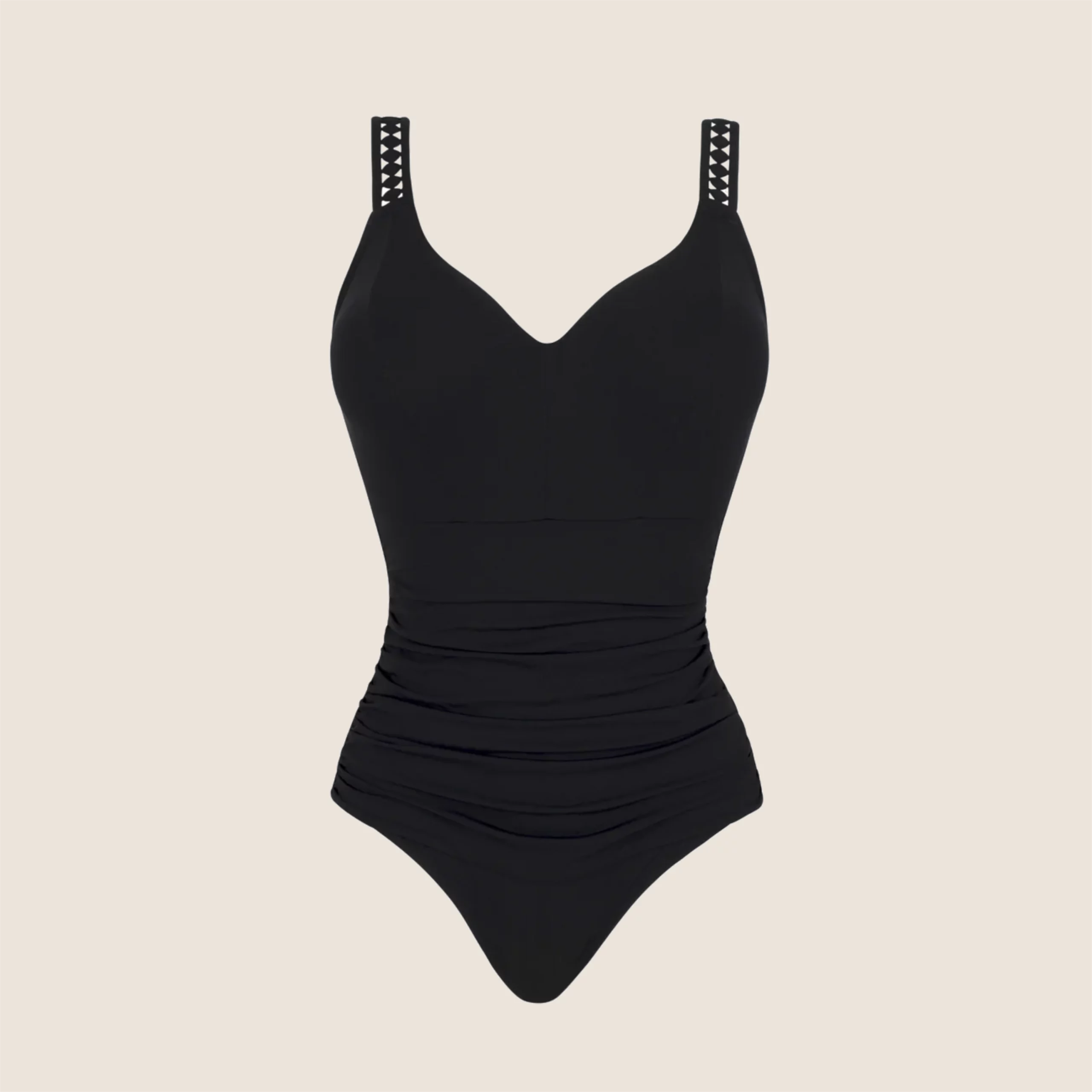 Baddräkten är designad med fokus på kontroll och elegans. Den inbyggda formande funktionen ger ett slätare intryck över mage och midja, medan den genomtänkta skärningen framhäver kroppen på ett naturligt och balanserat sätt. Resultatet är en baddräkt som sitter tryggt, känns bekväm hela dagen och ger ett självsäkert uttryck.
