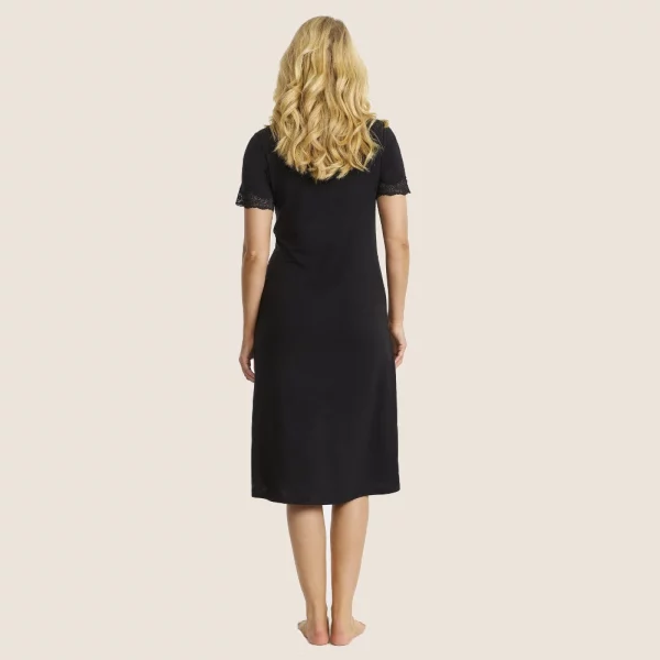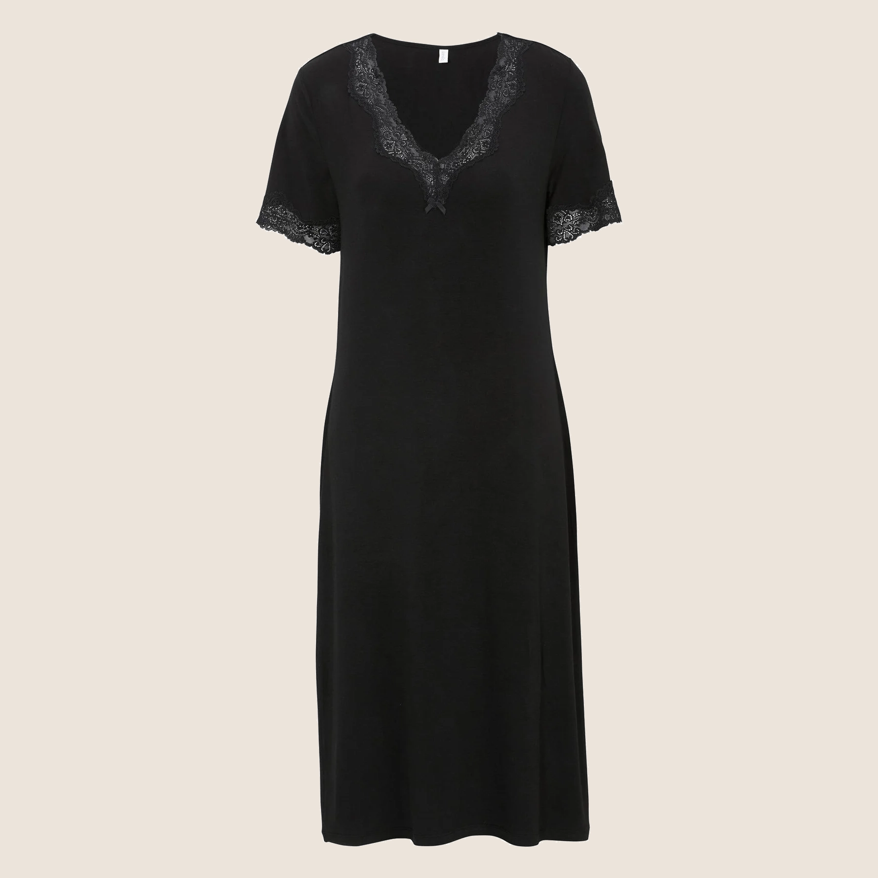 Nattlinne i bambuviskos från Damella med korta ärmar och spetsdetaljer. Mjukt, följsamt och elegant i svart, ivory och Rosewood.
