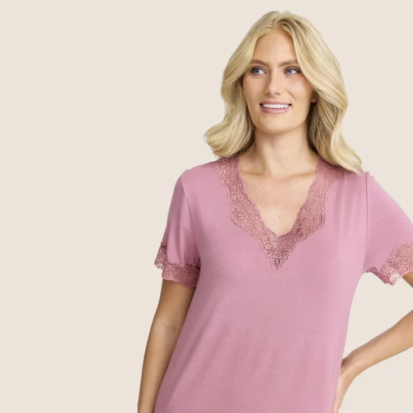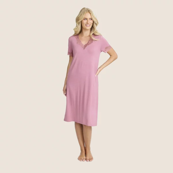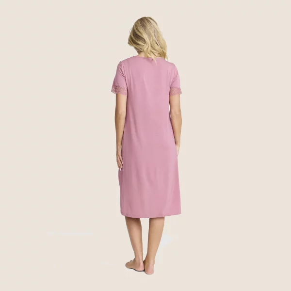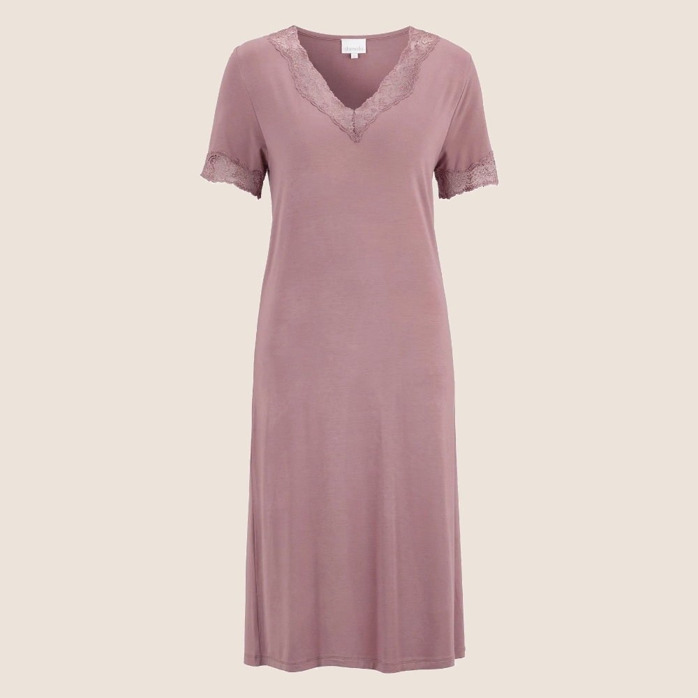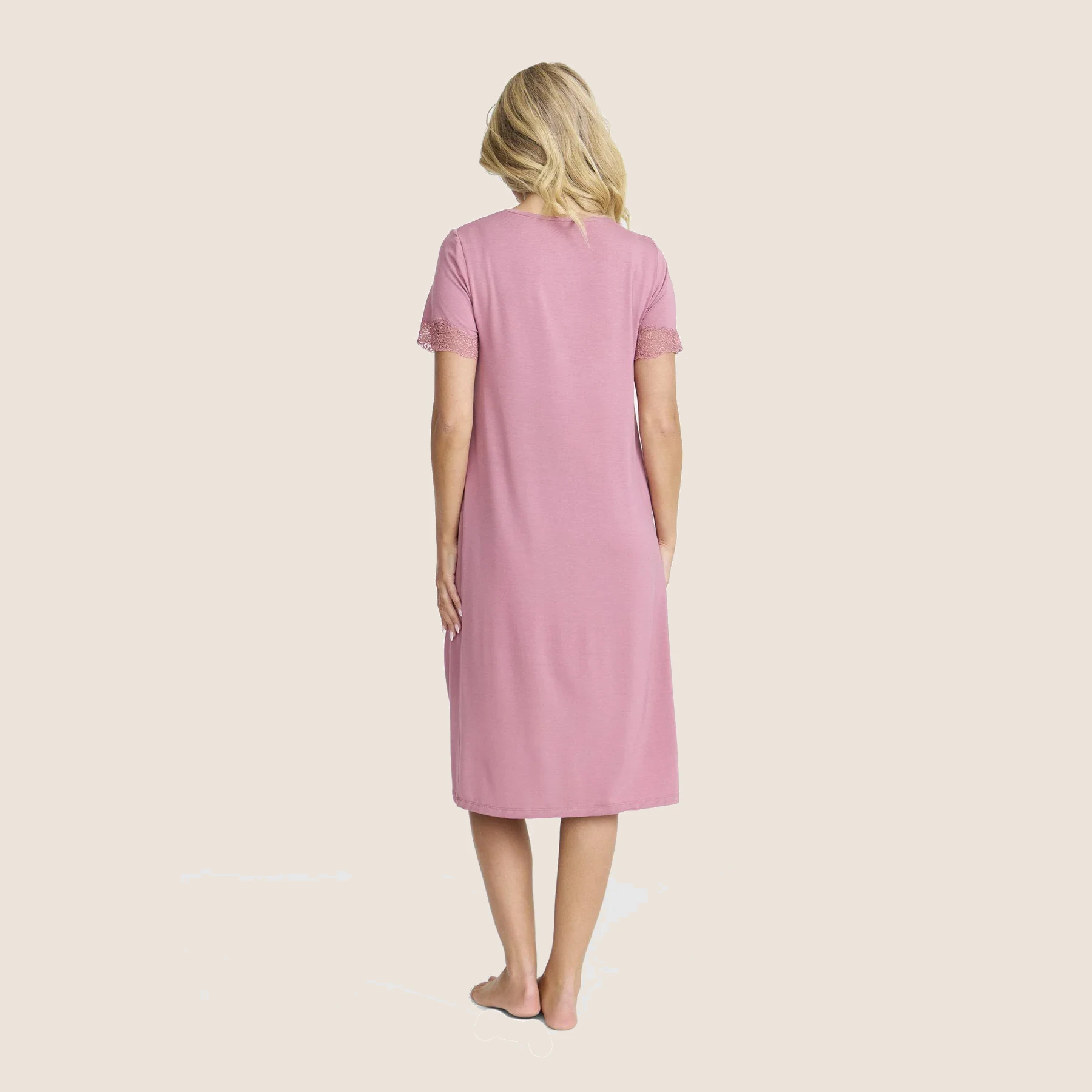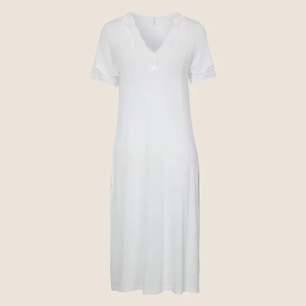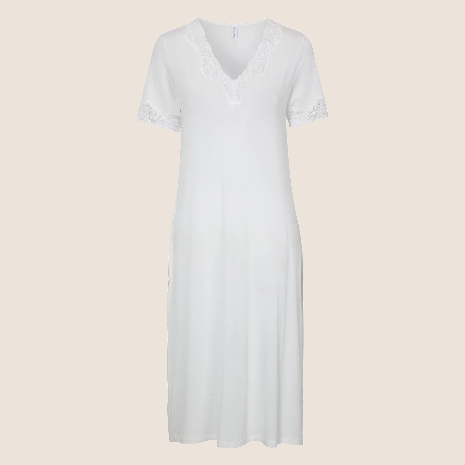 Designen har korta ärmar och är dekorerad med romantiska spetsdetaljer vid halsringning och ärmslut, vilket skapar en elegant och feminin look. Med sin generösa längd är nattlinnet lika praktiskt som vackert – ett plagg att trivas i natt efter natt.