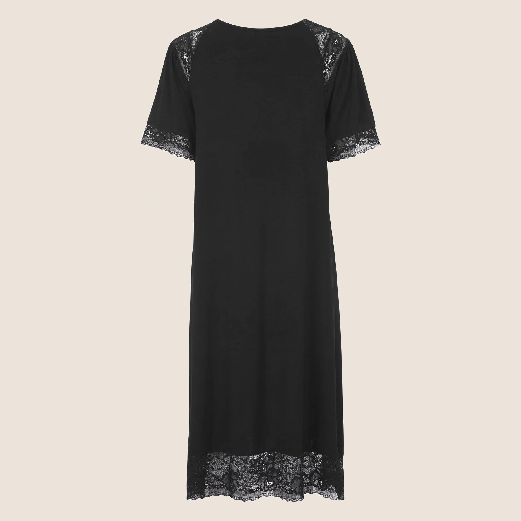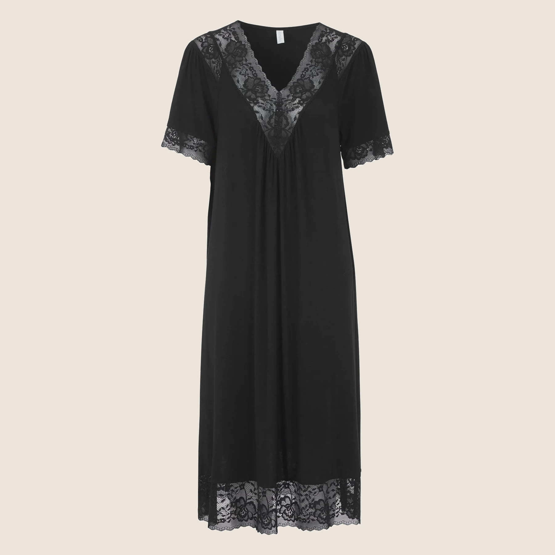 Nattlinne med korta ärmar och V-ringad hals från Damella i mjuk ecoveroviskos. Dekorerat med spetsdetaljer för en elegant känsla perfekt balans mellan stil och komfort.