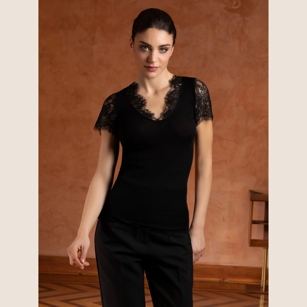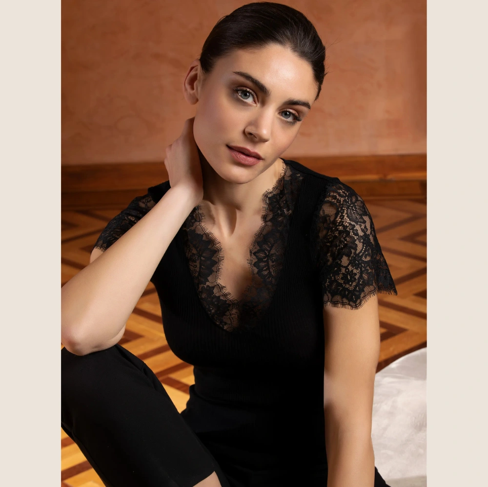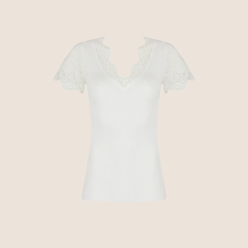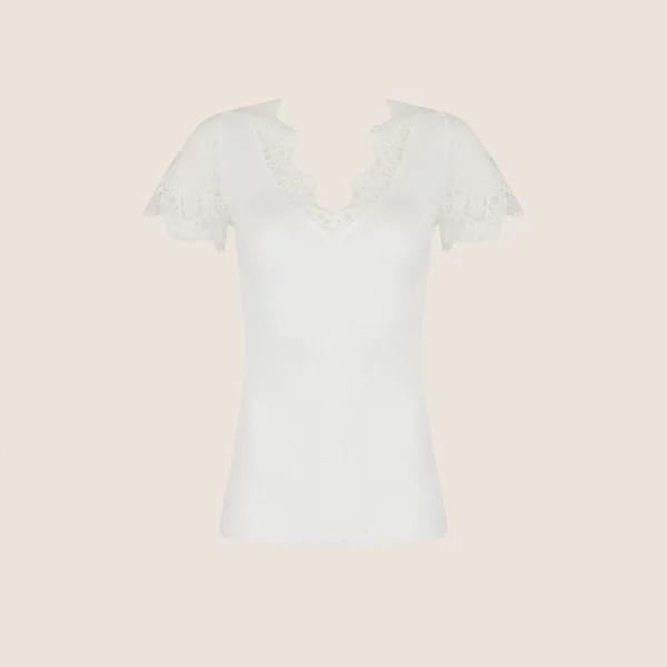 Lise Charmels Loungewear tröja med korta ärmar är den perfekta följeslagaren när du vill koppla av med elegans. Denna kortärmade tröja är tillverkad i en smidig och bekväm tubstickning med spetsinläggningar som smyckar urringningen och ärmarna.