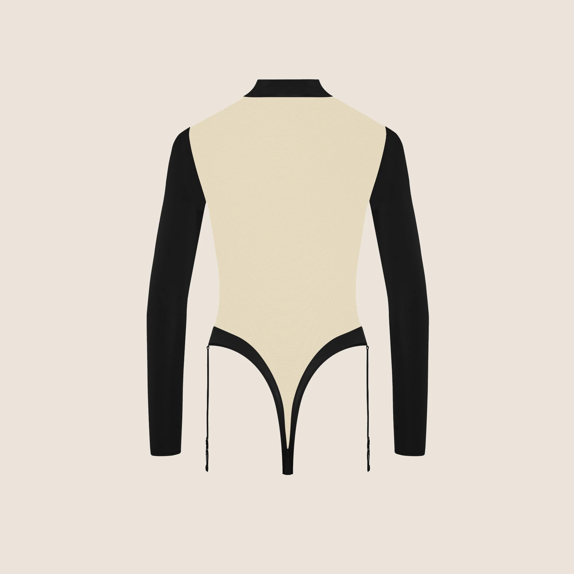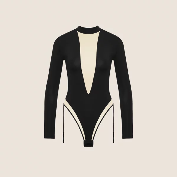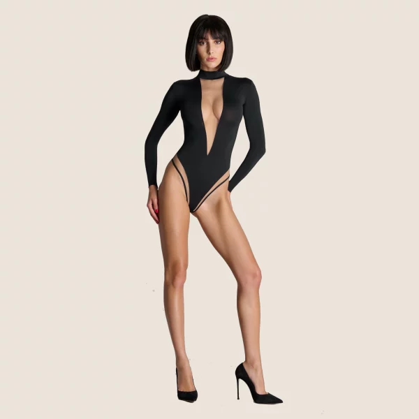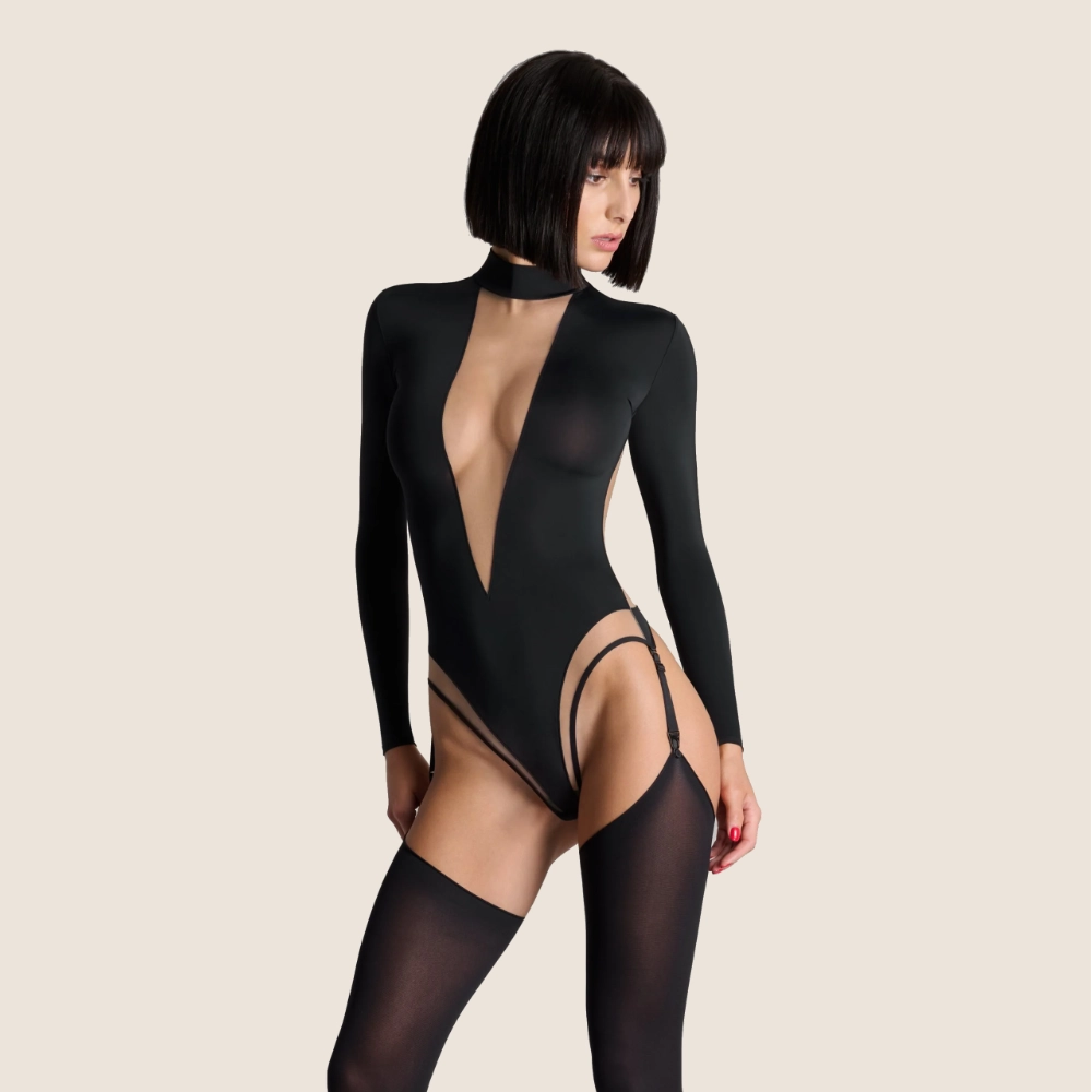En sensuell och elegant body med halterneck som kombinerar transparent tyll med mjuk mikrofiber. En kroppsnära design som formar silhuetten och bärs som en andra hud självsäker, modern och oemotståndlig.